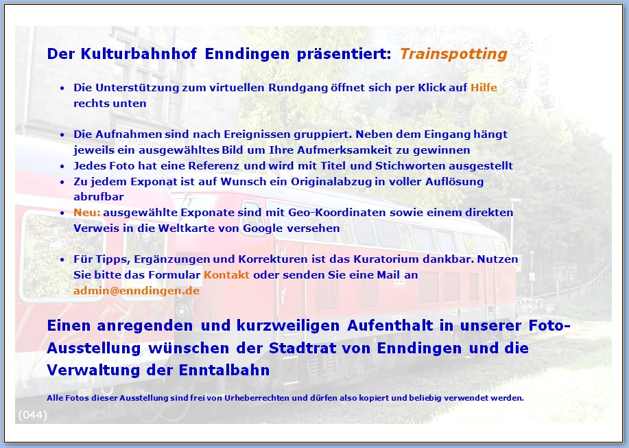 | 1 | Ihre Eintrittskarte zur Foto-Ausstellung TRAINSPOTTING. | |